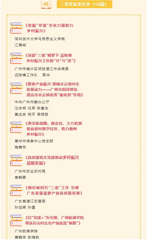 (党委宣传部 供稿)近日,由中共广东省委农村工作领导小组办公室主办,广东省农学会、广州国家农业科创中心承办的广东“学习贯彻习近平总书记关于‘三农’工作的重要论述”主题征文活动落下帷幕,评出一等奖6名,二等奖12名,三等奖18名,我校黄鹏举、陈海航撰写的《以“党建+”为引领,广州航海学院 帮扶花山村走出产业扶贫“新路”》喜获三等奖。