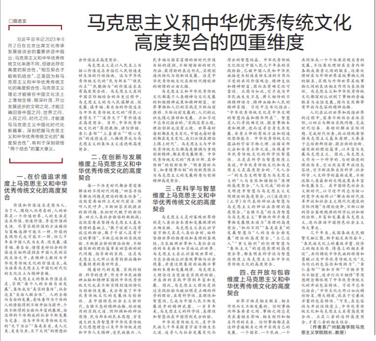 我校马克思主义学院院长田志文教授在《羊城晚报》理论版( 2023年7月7日,A6版)发表理论文章《马克思主义和中华优秀传统文化高度契合的四重维度》。文章认为,正是因为有马克思主义和中华优秀传统文化的高度契合性,马克思主义理论才能够在中国文化沃土上落地生根、根深叶茂,开出发展进步的文明之花,才能正确回答中国之问、世界之问、人民之问、时代之问,才能谱写马克思主义中国化时代化新篇章。深刻把握马克思主义和中华优秀传统文化的“高度契合”,有利于深刻领悟“两个结合”的重大意义。