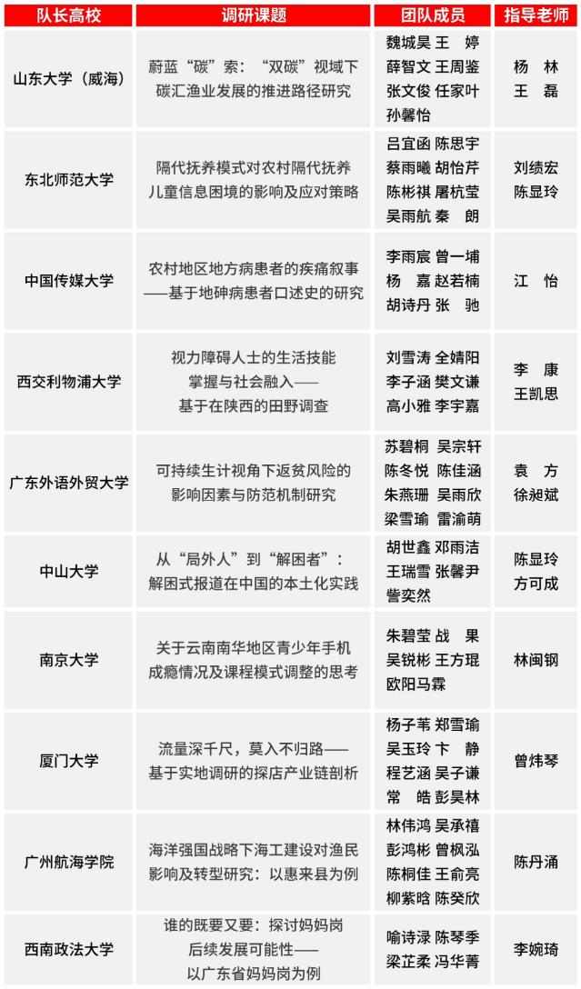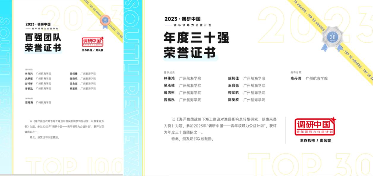 广州航海学院“长风举棹调研团”在陈丹涌副教授的精心组织与指导下,奔赴南海渔村,从微观视角解构海洋强国战略下的渔业发展,感受潮汕大地乡音乡情的归属感、感受惠来渔家勠力拼搏的故事,积极调研渔民在海工建设背景下发挥自身优势,积极转型,助力海洋强国、乡村振兴、区域经济高质量发展的生动实践,最终形成数万字的调研报告以及生动写实的调研视频。在此基础上,团队于今年6月入选“2023·调研中国”百强团队,9月入围“2023·调研中国”三十强团队,10月晋级“2023·调研中国”十强,11月最终荣获全国三等奖,充分彰显了我校优秀学子的家国情怀与社会担当。