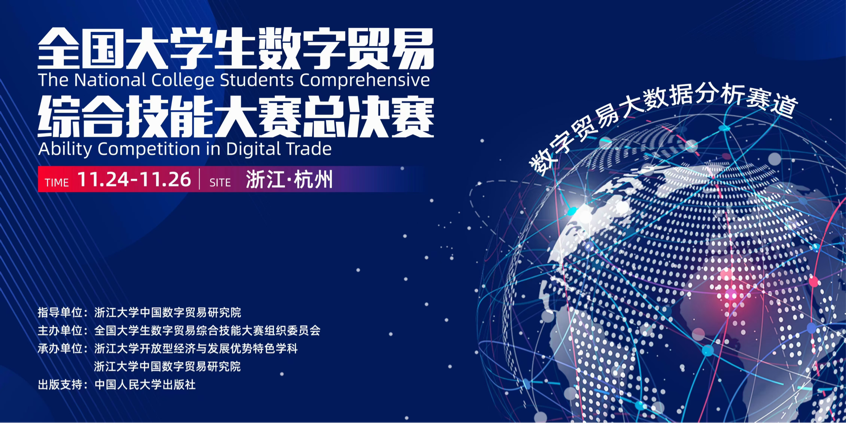 此次大赛由浙江大学中国数字贸易研究院担任指导单位,全国大学生数字贸易综合技能大赛组委会主办,浙江大学中国数字贸易研究院承办。大赛以“数字贸易、商通全球”为主题,通过数字贸易平台的仿真实操、数字贸易网络直播、数字贸易大数据分析、数字贸易创新创业计划书等多个环节的竞赛,旨在培养参赛学生的数字贸易专业技能、创新创业能力及团队合作精神,以适应国际贸易数字化的新趋势和新需求。