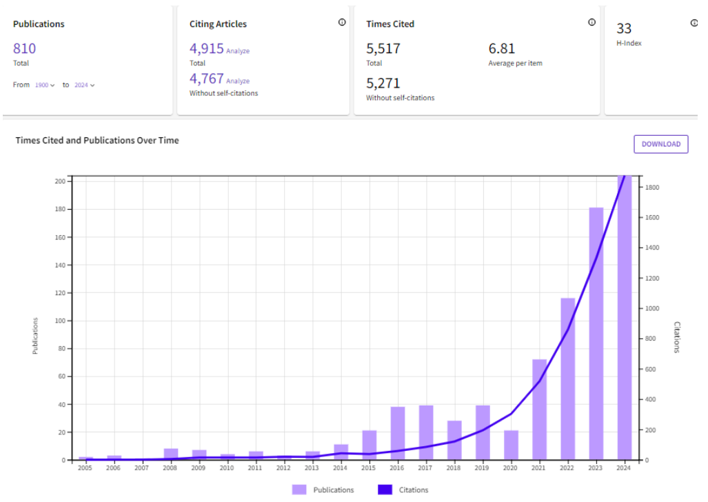 2024年10月16日,据科睿唯安旗下Web of Science平台统计的我校科研论文成果分析,我校科研成果影响力显著提升。自2005年至今,成果产出共计810篇论文,总被引次数达到5517次,篇均被引用次数为8.81次。2021-2023年,学校的科研成果数量进入快速增长轨道,每年较上年度增幅都超过了56%,三年累计增幅达761%。