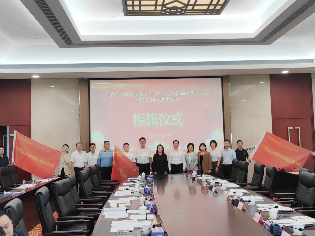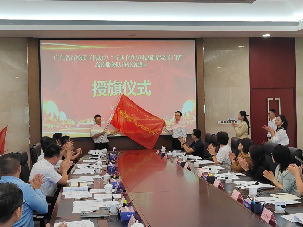廖平还分别向广州航海学院、广州体育职业技术学院、广州华商学院授予百校联百县助力“百千万工程”行动驻增城区服务队队旗。