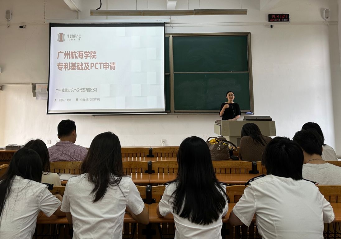 讲座中,龙婷简要介绍了公司核心业务基本情况。她以“专利基础知识及PCT申请”为主题,围绕专利制度的运行逻辑及独特属性,系统梳理了专利申请文件的要求及材料准备要点,并全面解析了从受理到授权的全流程专利审查程序。同时,结合国家知识产权局最新审查动态与政策导向,对巴黎公约、 PCT 国际申请、海牙协定等海外专利布局路径进行前沿解读,帮助广大师生精准把握国内外专利申请实务要点与发展趋势。