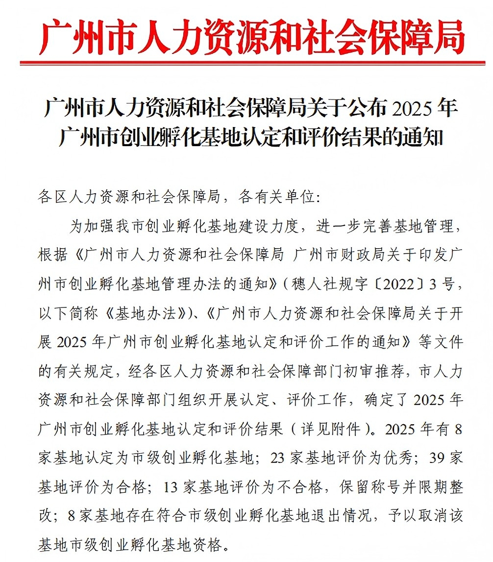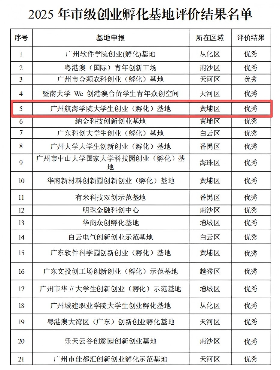 近日,广州市人力资源和社会保障局公布了2025年度市级创业孵化基地绩效评价结果。广州航海学院大学生创业孵化基地(以下简称“基地”)在全市83家参与评比的基地中表现突出,荣获“优秀”等级。