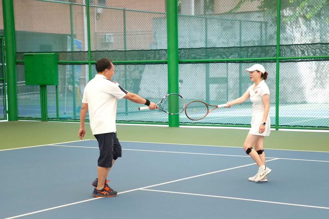 赛场之上,既有竞技的紧张激烈,更有温情与精神的传递——陶韶菁书记与招乐辉副书记组成的搭档格外引人注目,他们在表演赛中精彩表现,在攻防转换间展现出校领导们亲和务实的作风与奋进拼搏的精神;“86 届校友夫妻档”组合从校园同窗到人生伴侣,并肩挥拍格外默契,将校友情与伴侣情融入每一次攻防,成为赛场一道浪漫风景线;曾参与2025年九三阅兵的黎炜怡校友以昂扬向上的姿态、永不言弃的劲头,生动诠释“坚韧拼搏、担当奉献”的航海人精神,赢得现场阵阵喝彩。