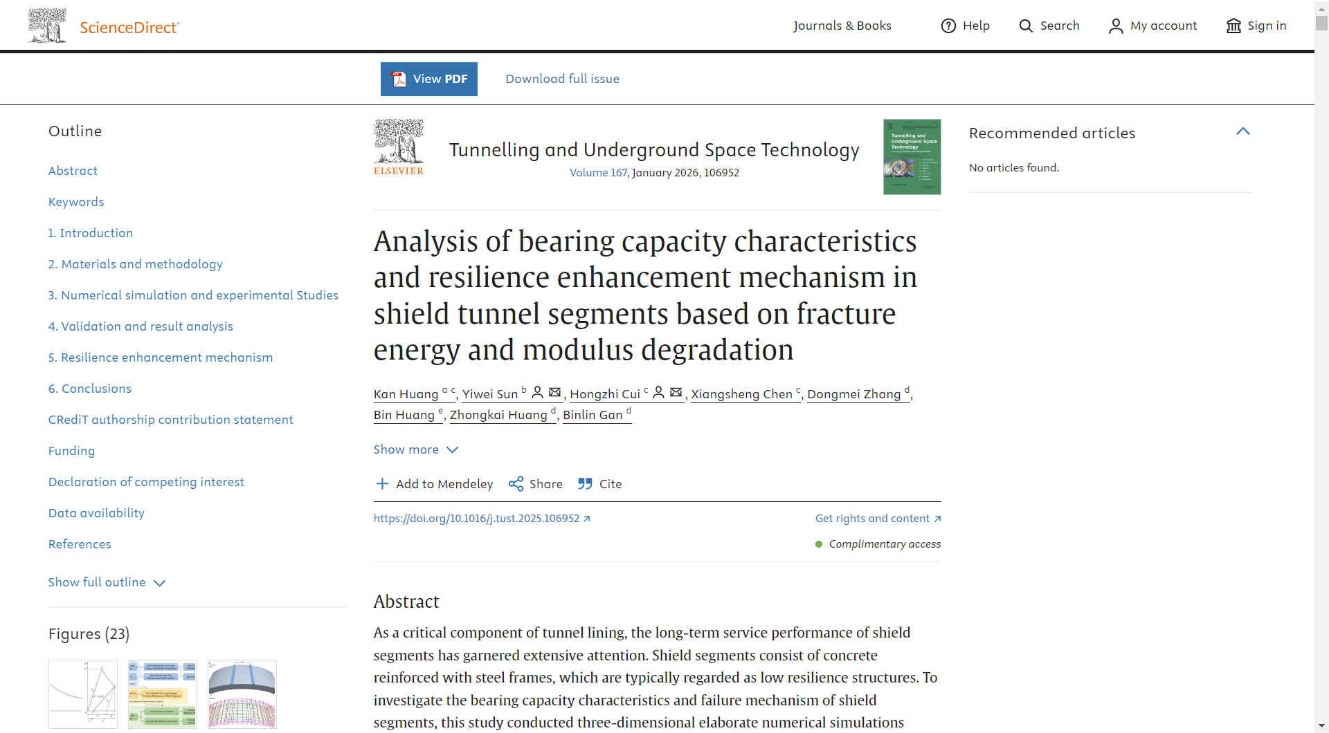 论文以广州航海学院为第一单位、依托黄戡主持的国家重点研发计划(子项)完成。黄戡、陈湘生创新构建“基于考虑断裂能与模量退化的混凝土塑性损伤模型”,通过三维精细化数值模拟,深入研究其承载力特征及韧性提升机理,并通过大型足尺试验对模拟结果进行了验证。其研究成果为城市轨道交通盾构隧道安全运维提供关键技术支撑,标志着学校在交通工程特色领域的科研实力获国际权威认可。