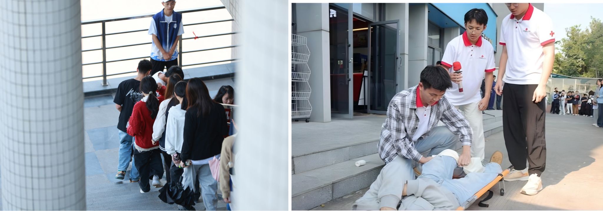 讲座结束后,模拟郑和堂突发火情开展疏散实战演练。现场工作人员立即发出警报并切断楼宇电源,疏散组成员在楼梯口、转角处引导师生,大家遵循“单排靠墙、弯腰疾走、捂住口鼻”的逃生原则,快速有序撤离至安全区域,各学院带队老师迅速清点人数并汇报。与此同时,应急救援组携带专业装备火速到场,开展灭火与搜救工作,成功将“伤员”转移至医务点,由校医、校红十字会人员开展应急救治。警戒组及时清理消防通道保障畅通,各环节衔接紧密、协同高效。