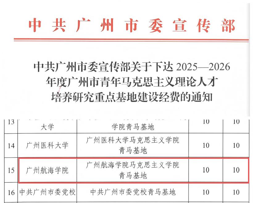 近日,第三轮(2025—2028)广州市青年马克思主义理论人才培养研究基地建设正式启动。广州航海学院凭借扎实的马克思主义理论研究基础与鲜明的实践育人特色,成功获批一般基地,资助建设经费10万元,建设周期为三年。这是学校在马克思主义理论学科建设与青年人才培养领域取得的重要突破。