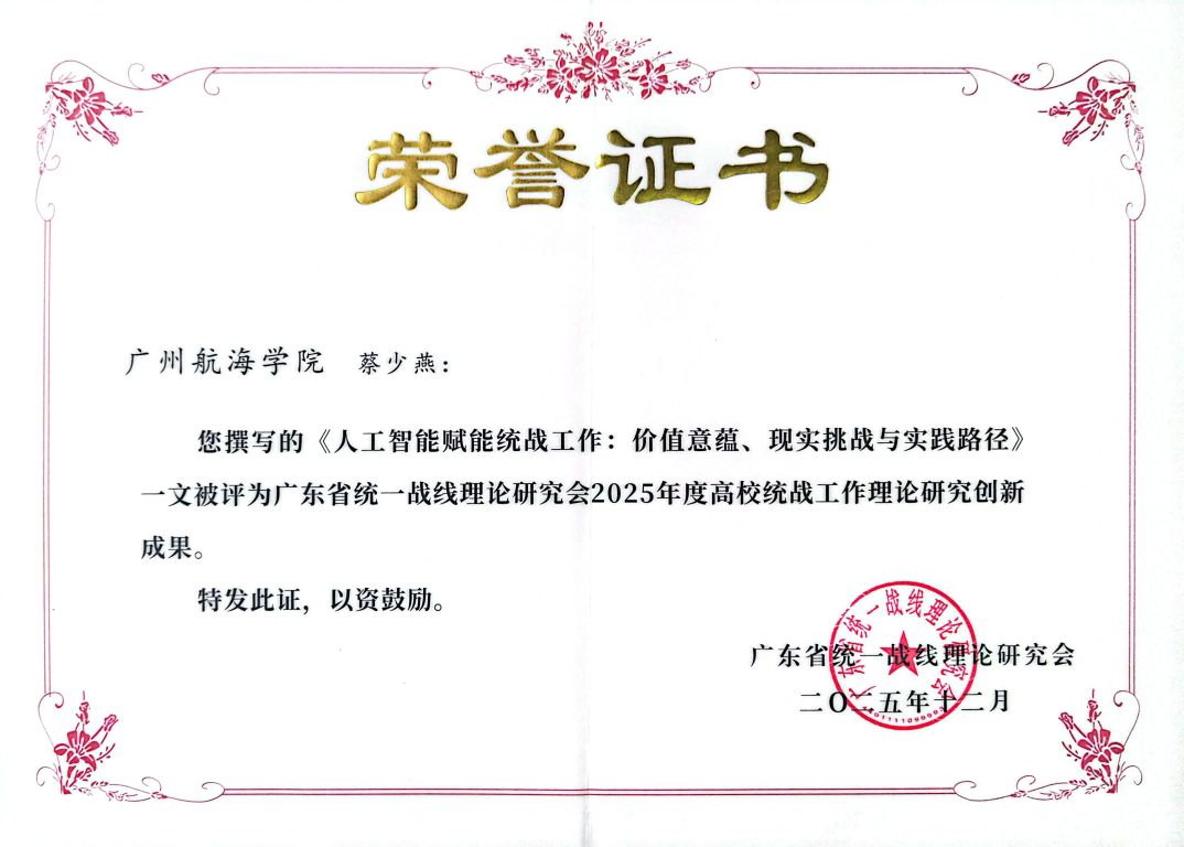 12月10日至11日,2025年广东省统一战线理论研究会高校统战工作理论研究成果交流活动在东莞市举行。省委统战部常务副部长郭汉毅,省委统战部副部长、省统战理论研究会会长黄育振,东莞市委常委、统战部部长陈志伟等有关领导出席。会议表彰了研究会评选的50篇优秀理论成果,广州航海学院马克思主义学院蔡少燕博士撰写的《人工智能赋能统战工作:价值意蕴、现实挑战与实践路径》一文,被评为广东省统一战线理论研究会2025年度高校统战工作理论研究创新成果。