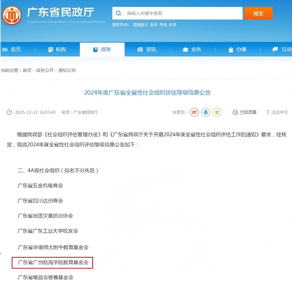 2025年12月22日,广东省民政厅发布《2024年度广东省全省性社会组织评估等级结果公告》,广东省广州航海学院教育基金会(以下简称“基金会”)荣获4A级社会组织称号。这份荣誉,是对基金会在依法治会、内部治理、党建工作、工作绩效和社会影响力等方面工作的高度肯定,标志着基金会的规范化、专业化建设迈上了新台阶。