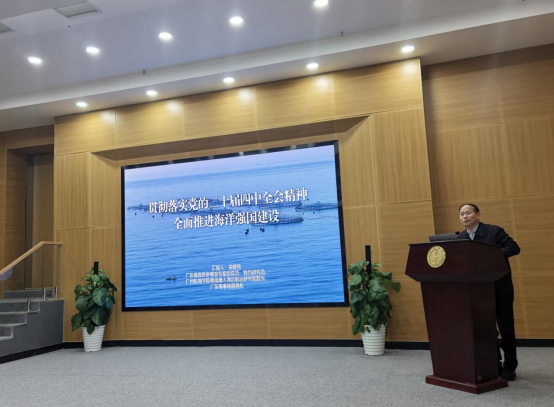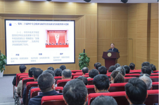 梁建伟以《贯彻落实党的二十届四中全会精神,全面推进海洋强国建设》为题,系统阐释了党的二十届四中全会精神与海洋强国建设的内在逻辑,围绕“科技引领、融合赋能、陆海联动、绿色转型”四大核心维度,深入解读“十五五”规划为海洋产业发展注入的新动能、新机遇,立足当前国际国内复杂形势,全面剖析了我国海洋经济发展的独特优势、面临挑战及实践路径。并从强化办学定位、勇担特殊使命,打造高水平人才培养体系,提升科技创新转化能力,加强社会服务与智库建设,深化国际合作等方面为学校高质量发展提出建设性意见和建议,为学校在海洋强国建设大局中找准角色定位、主动履职尽责提供了重要的战略参考与实践启发。