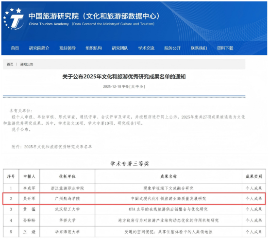 近日,中国旅游研究院(文化和旅游部数据中心)公布2025年文化和旅游优秀研究成果名单,广州航海学院吴开军教授学术专著《中国式现代化引领旅游业高质量发展研究》荣获学术专著类三等奖,这是学校首次获得该奖项。