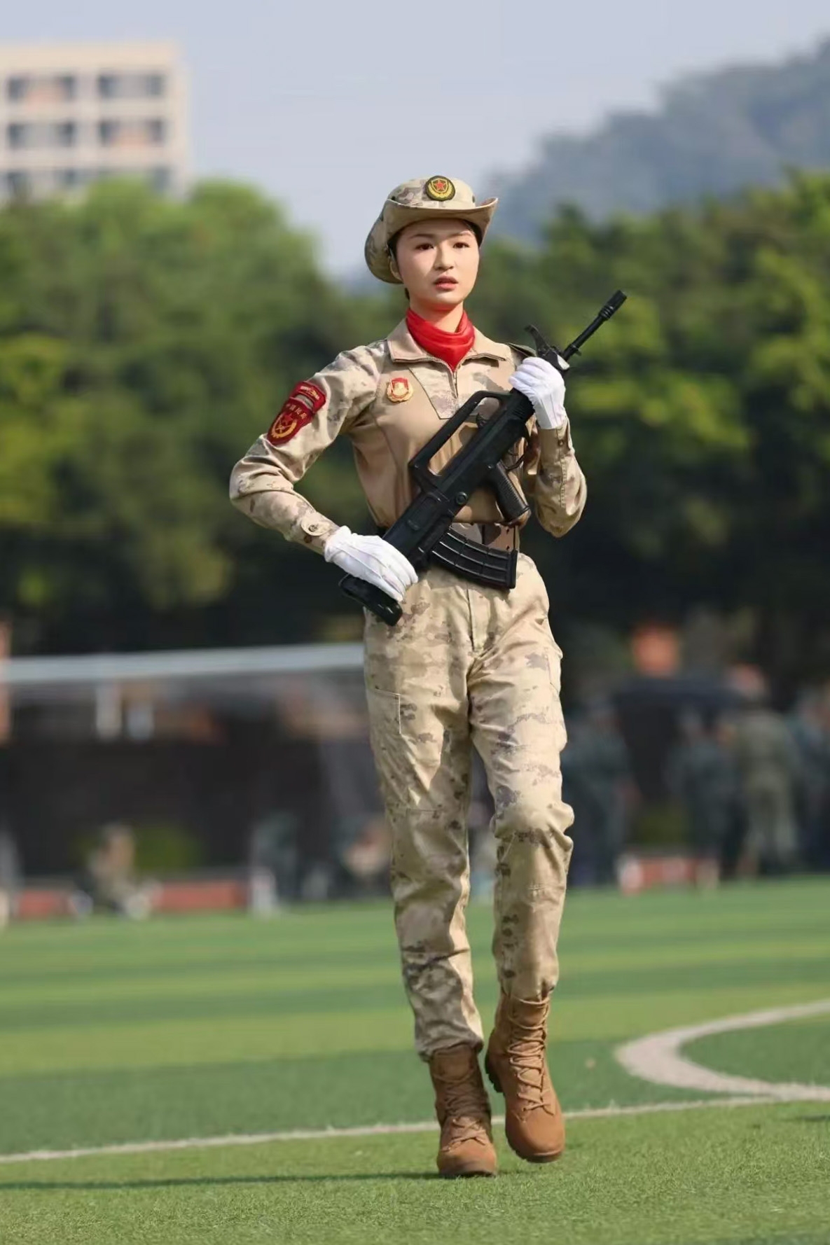 训练现场,黎炜怡以阅兵标准为基准,对军训核心动作进行拆解示范。她先整体展示持枪军姿、踢腿摆臂等完整动作,再针对每个环节的要领进行讲解,重点强调身体重心控制、动作幅度规范等关键细节。在指导过程中,她格外注重方阵整体的协同性,反复纠正队列排面的整齐度。随后,她走入新生队列,逐一查看每位学生的动作,对脚步落点、脚尖弧度、提胯发力等细节问题进行针对性指导,确保新生准确掌握动作规范。