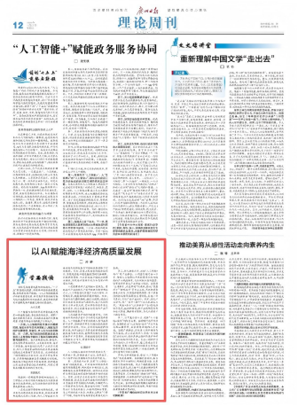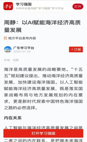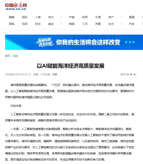 2026年1月27日,《广州日报》A12(理论周刊)刊发广州航海学院马克思主义学院周静博士的理论文章《以AI赋能海洋经济高质量发展》。该文被中国经济网和“学习强国”学习平台全文转载。