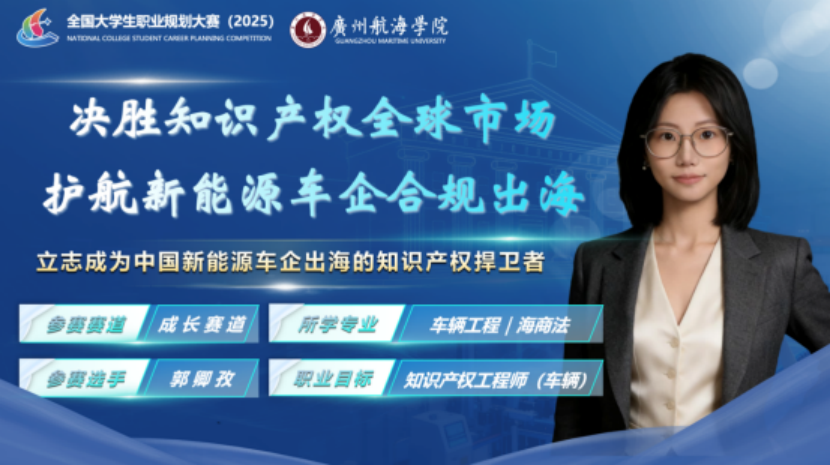 参赛作品是“决胜知识产权全球市场,护航新能源车企合规出海”。参赛口号是“立志成为护航中国新能源车企合格出海的知识产权工程师”。