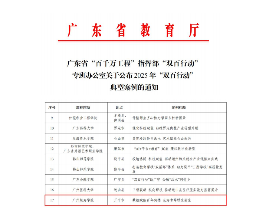 近日,广东省“百千万工程”指挥部“双百行动”专班办公室公布2025年“双百行动”典型案例,广州航海学院城乡规划建设案例《数绘赋能百年骑楼,荻海古埠蝶变新生》入选,成为全省获评的30个典型案例之一。