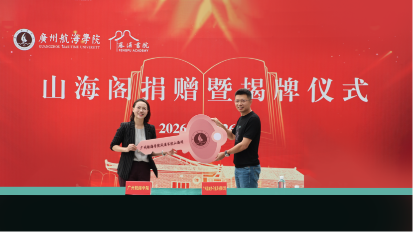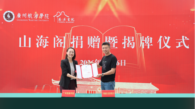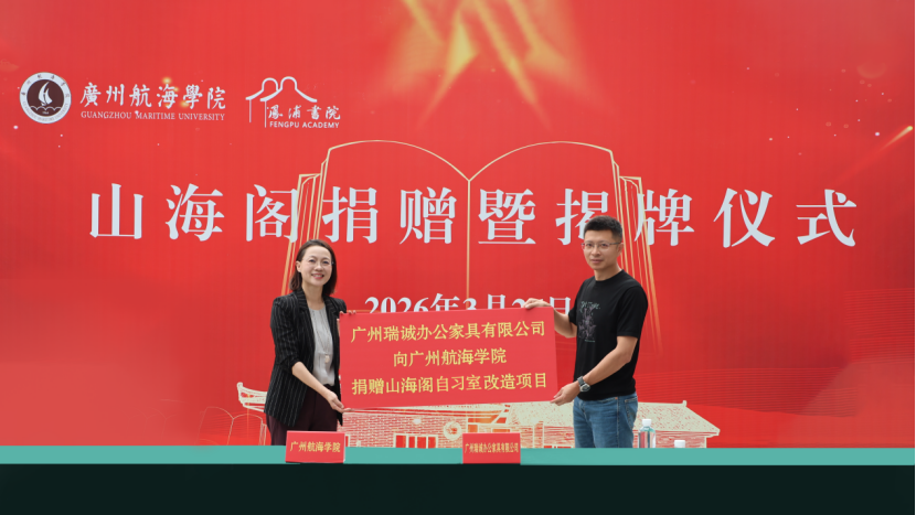3月26日下午,广州航海学院在琶洲校区图书馆举行“山海阁”捐赠暨揭牌仪式。学校党委书记陶韶菁、广州瑞诚办公家具有限公司总经理黄勇等领导嘉宾出席仪式并共同为“山海阁”揭牌。学校党委副书记胡命杰,纪委书记陆志英,副校长陈建平出席仪式,副校长张劲文主持仪式。