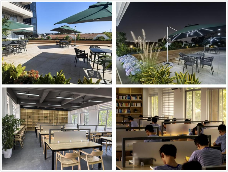 “山海阁”由广州瑞诚办公家具有限公司捐建,由两间课室和办公室改造而成。此次改造让琶洲校区图书馆建筑面积由1500㎡扩大至2100㎡,室外园林面积增加280㎡,阅览席由原来180个增至356个,集阅读自习、交流研讨于一体,为师生提供了功能齐全、环境雅致的学习交流空间。