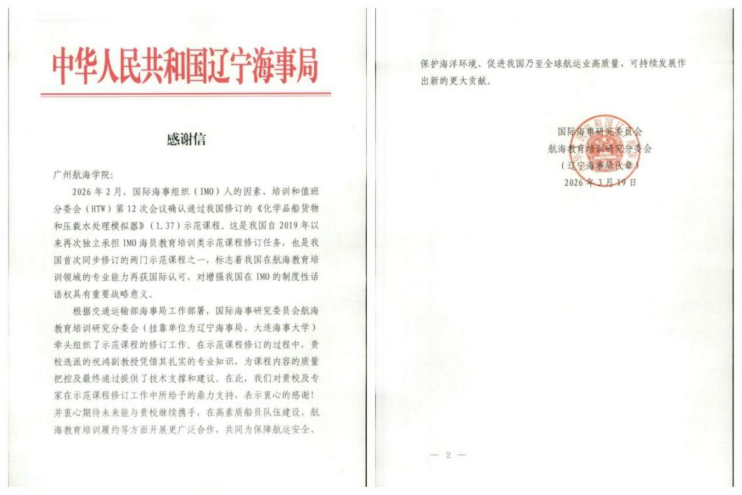 此次助力我国海事示范课程获IMO通过,是学校锚定海洋强国战略、以党建引领航海教育高质量发展的生动实践,也是学校深度参与国际海事领域话语权构建的重要成果。未来,学校将持续深化党建与航海教育融合发展、同频共振,聚焦航运人才培养核心任务,培育兼具国际视野、海洋情怀和创新能力的航运高素质人才,为全球航运业高质量发展注入广航动能。