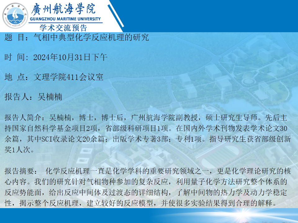 深蓝论坛讲座预告:吴楠楠《气相中典型化学反应机理的研究》