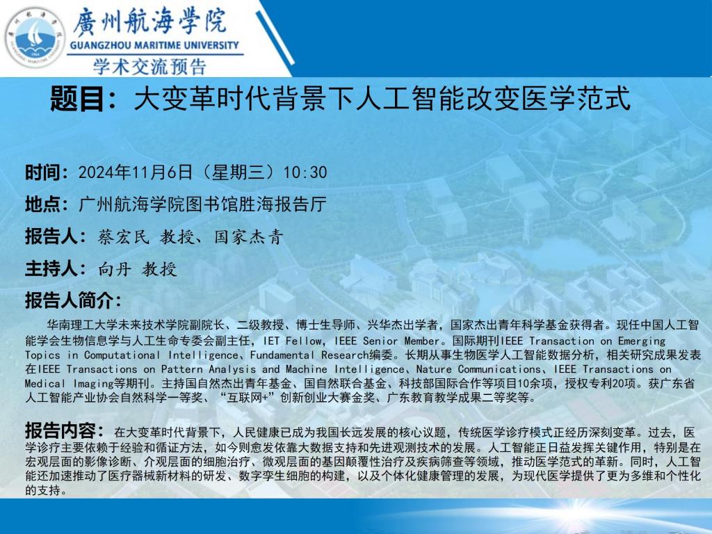 学术讲座预告:蔡宏民《大变革时代背景下人工智能改变医学范式》