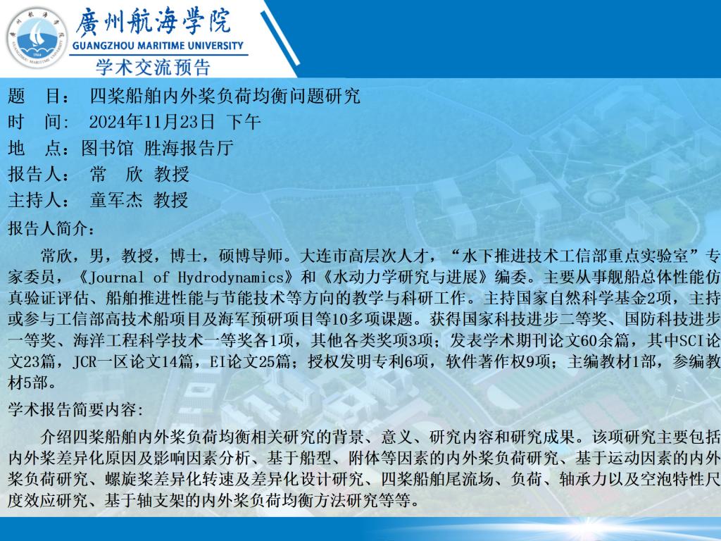 学术讲座预告:常欣教授《四桨船舶内外桨负荷均衡问题研究》