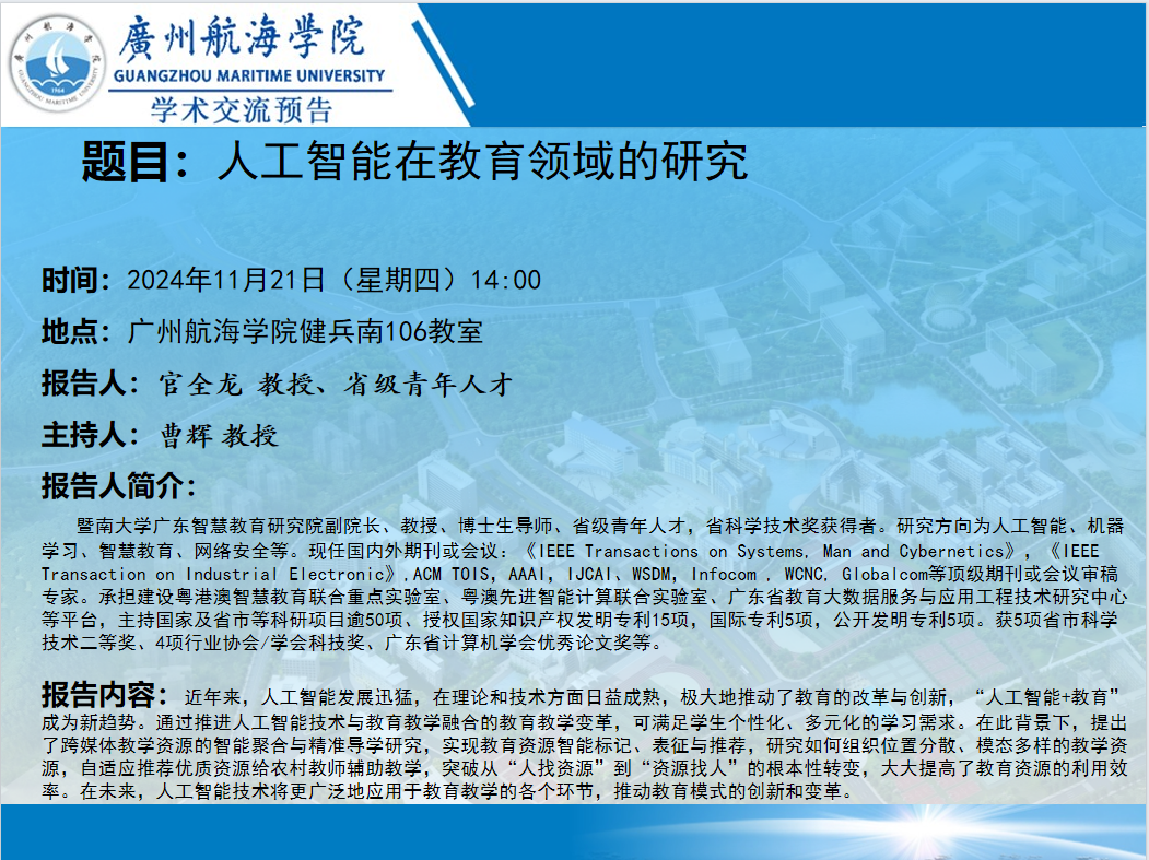 学术讲座预告:官全龙教授《人工智能在教育领域的研究》
