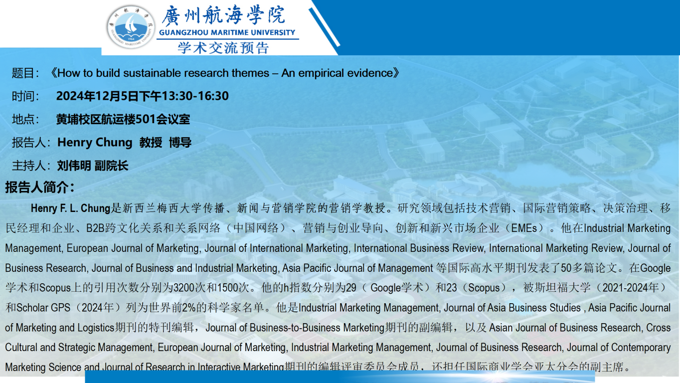 学术交流预告:Henry Chung 教授 博导《How to build sustainable research themes-An empirical evidence》