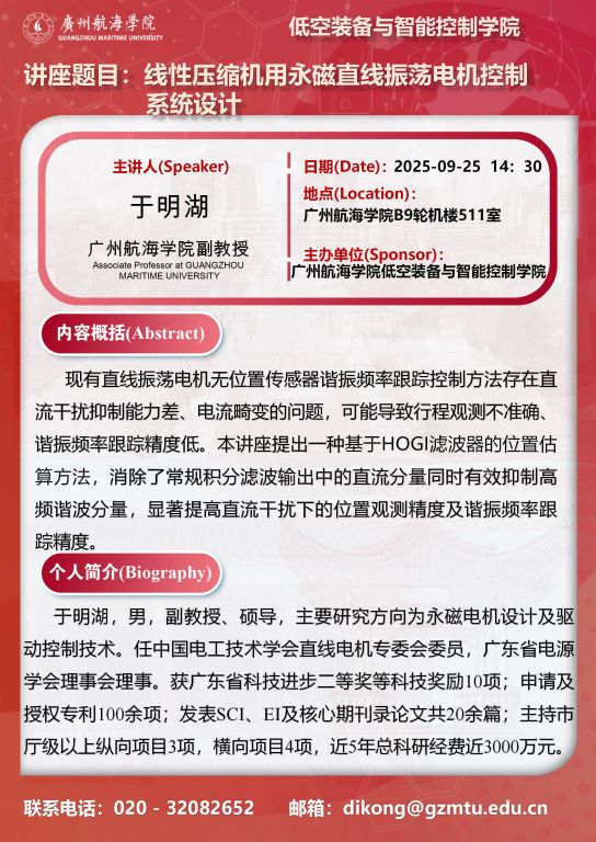 学术讲座预告:于明湖《线性压缩机用永磁直线振荡电机控制系统设计》
