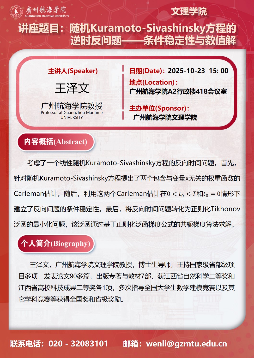 学术讲座预告:王泽文《随机Kuramoto-Sivashinsky方程的逆时反问题——条件稳定性与数值解》